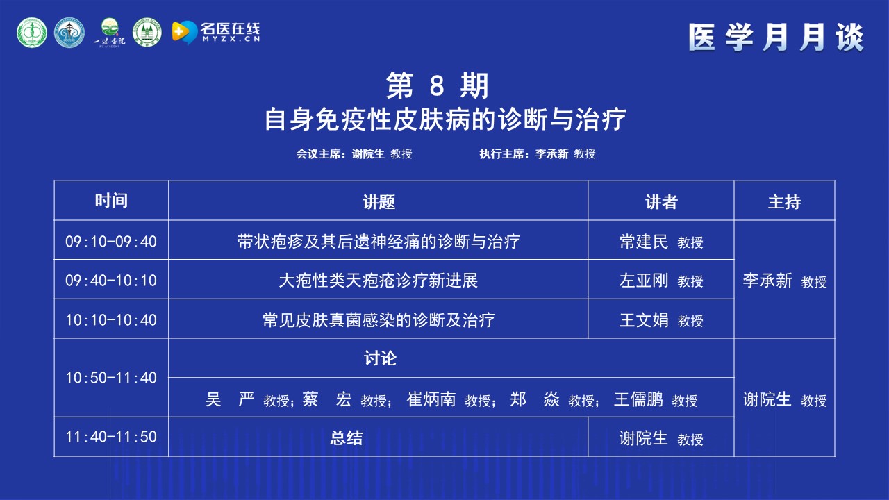 謝教授簡單介紹了“醫學月月談”的前身“腎病月月壇”的歷史,“腎病月月壇”是在疫情防控期間開展的線上學術交流活動,以腎臟病或系統性疾病腎損害的診治為主,每期一個主題,形式和內容都很受歡迎。為了讓更多的人受益,升級為“醫學月月談”。“醫學月月談”是一個以臨床需求為導向、以解決臨床問題為目的、線下和線上相結合的醫學交流活動。本期醫學月月談的主題是自身免疫性皮膚病的診斷與治療,之所以選擇這個專題,主要基于兩點考慮:其一,"醫學月月談"始終秉持跨學科理念,涵蓋腎科、皮膚科、風濕免疫科等多領域;其二,腎病患者普遍存在免疫力低下問題,尤其在應用激素和免疫抑制劑后,易并發帶狀皰疹、皮膚真菌感染、大皰性皮膚病等,這些并發癥嚴重影響患者生活質量和預后。因此,本期特別邀請到在自身免疫性皮膚病研究領域非常著名的李承新教授作為本期的執行主席,相信本期月月談在李教授的引導下,在各位專家們的大力支持下,取得圓滿成功。