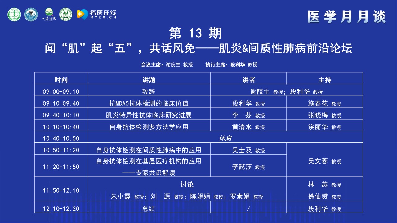 謝教授簡單介紹了“醫學月月談”的前身“腎病月月壇”的歷史,“腎病月月壇”是在疫情防控期間開展的線上學術交流活動,以腎臟病或系統性疾病腎損害的診治為主,每期一個主題,形式和內容都很受歡迎。為了讓更多的人受益,升級為“醫學月月談”?!搬t學月月談”秉承“腎病月月壇”的優良傳統,聚焦醫學工作的熱點和難點,以臨床需求為導向,以解決臨床問題為目的,每月主辦1-2次線下和線上相結合的醫學交流活動,線下在全國的城市輪流舉辦,已成功舉辦12期醫學月月談。本期醫學月月談的主題是: 聞“肌”起“五”,共話風免——肌炎&間質性肺病前沿論壇,非常榮幸的邀請到江西省人民醫院段利華教授作為本期的執行主席,相信本期月月談將在段教授的引導下,在各位專家們的大力支持下,取得圓滿成功。